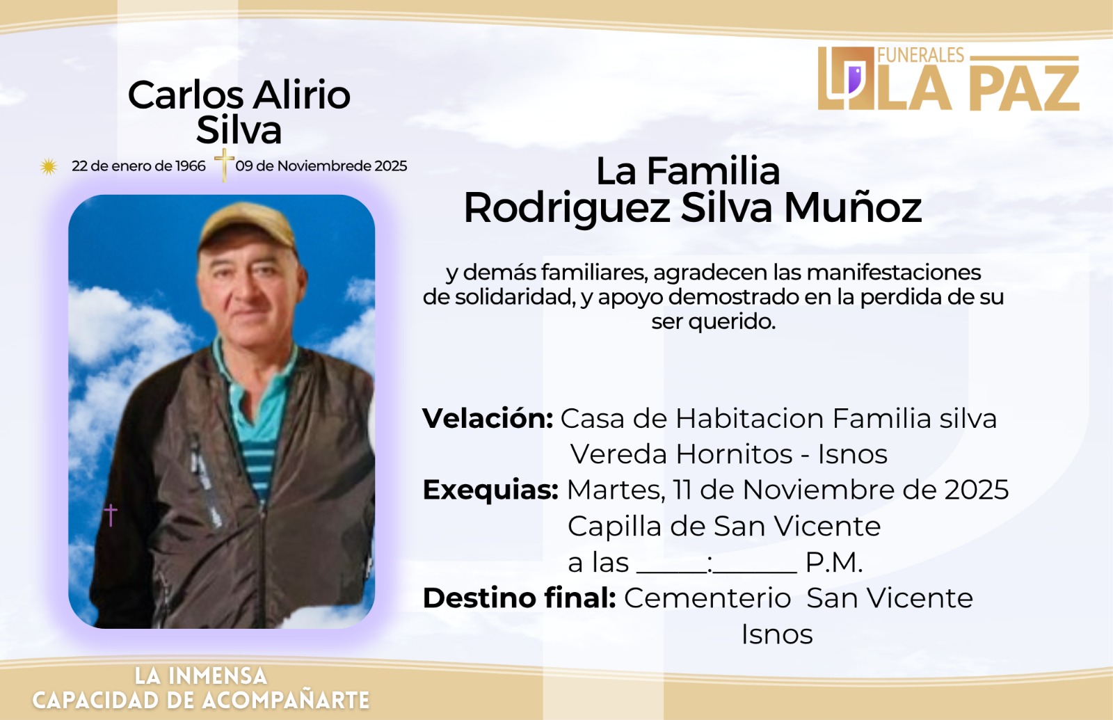 Funerales la Paz se solidariza y se une en oración con la familia Rodriguez Silva Muñoz, comunidad en general y amigos en la partida del Sr. Carlos Alirio Silva.