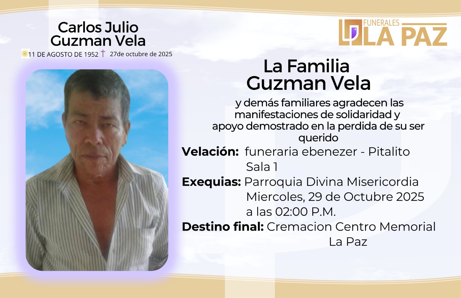 Funerales la Paz se solidariza y se une en oración con la familia Guzmán Vela, comunidad en general y amigos en la partida del Sr. Carlos Julio Guzmán Vela.