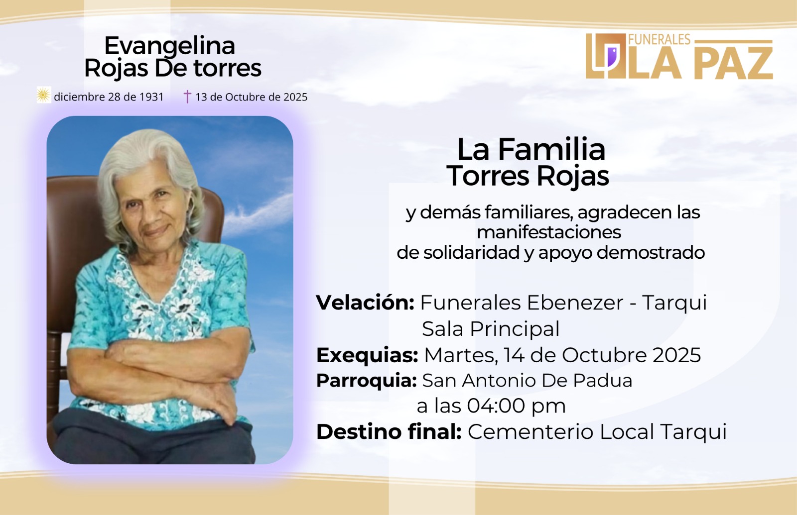 Funerales la Paz se solidariza y se une en oración con la familia Torres Rojas, comunidad en general y amigos en la partida de la Sra. Evangelina Rojas de Torres.