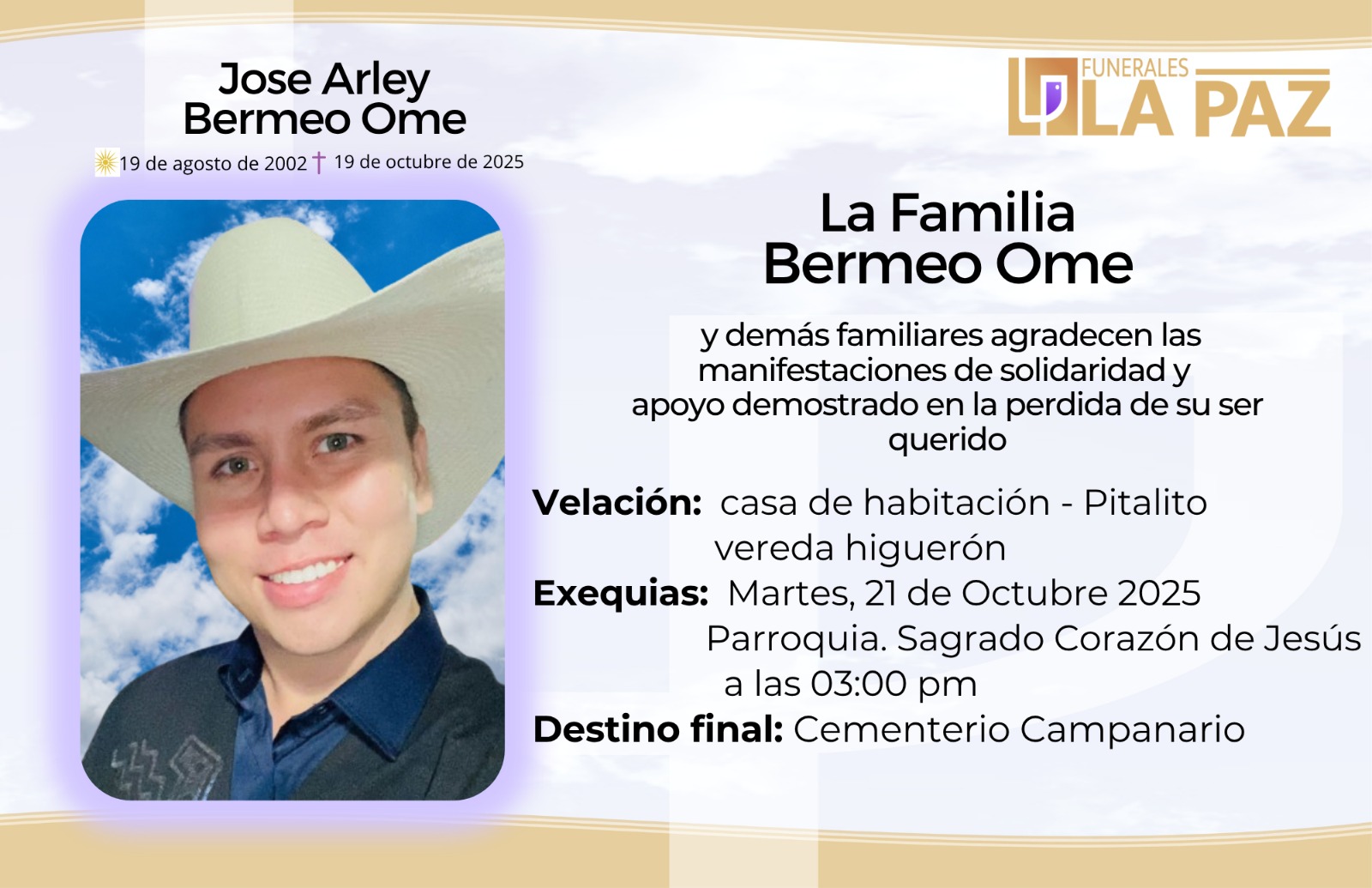 Funerales la Paz se solidariza y se une en oración con la familia Bermeo Ome, comunidad en general y amigos en la partida de José Arley Bermeo Ome.
