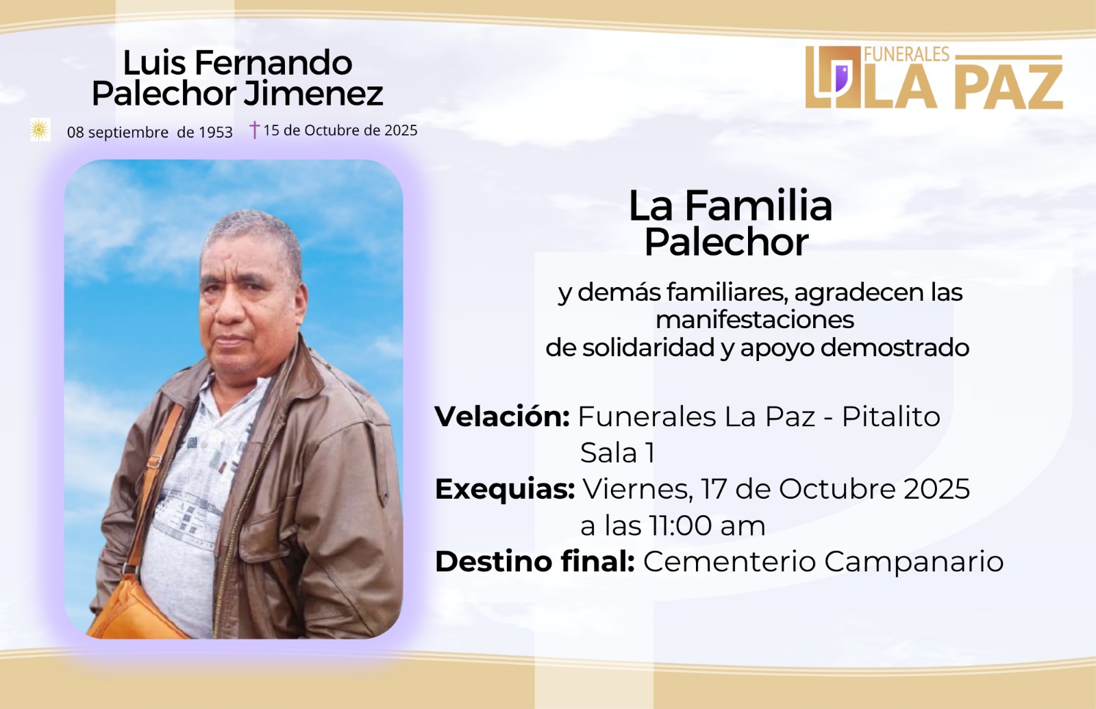 Funerales la Paz se solidariza y se une en oración con la familia Palechor, comunidad en general y amigos en la partida del Sr. Luis Fernando Palechor Jiménez.