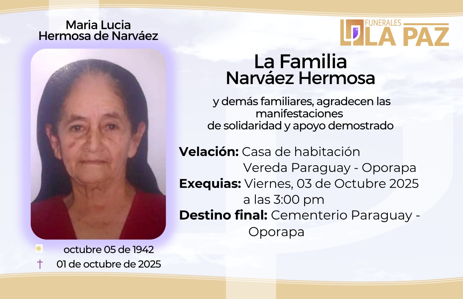 Funerales la Paz se solidariza y se une en oración con las familia Narváez Hermosa, comunidad en general y amigos en la partida de la Sra. María Lucia Hermosa de Narváez