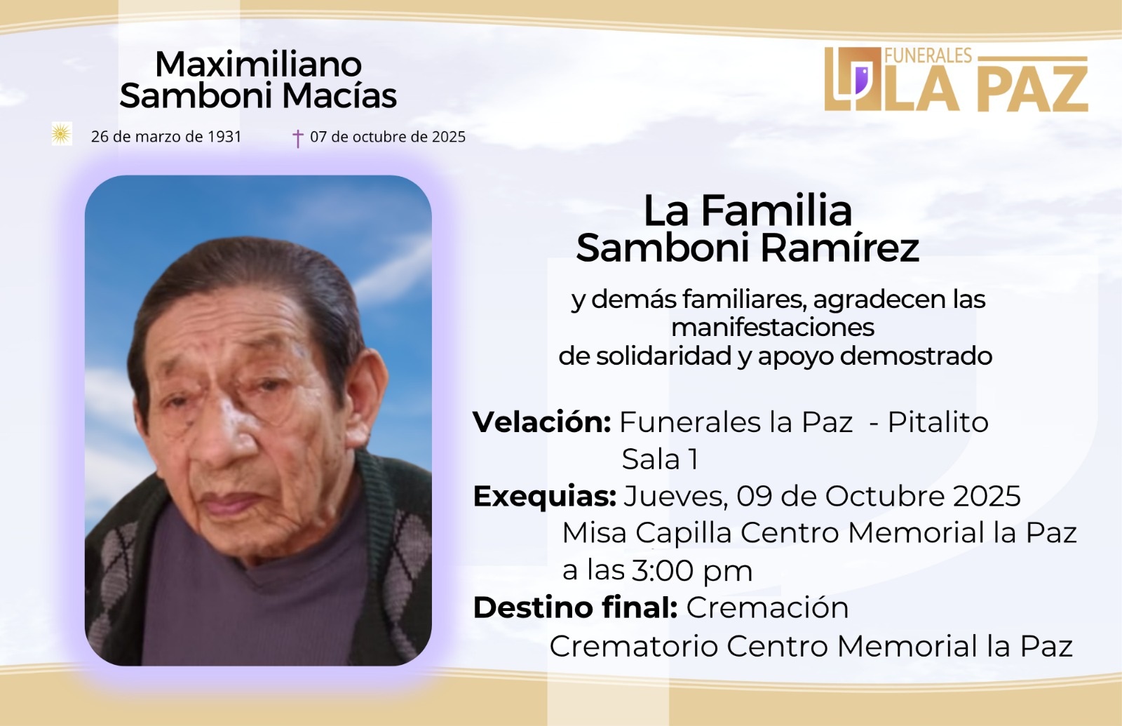 Funerales la Paz se solidariza y se une en oración con la familia Samboni Ramírez, comunidad en general y amigos en la partida del Sr. Maximiliano Samboni Macías.