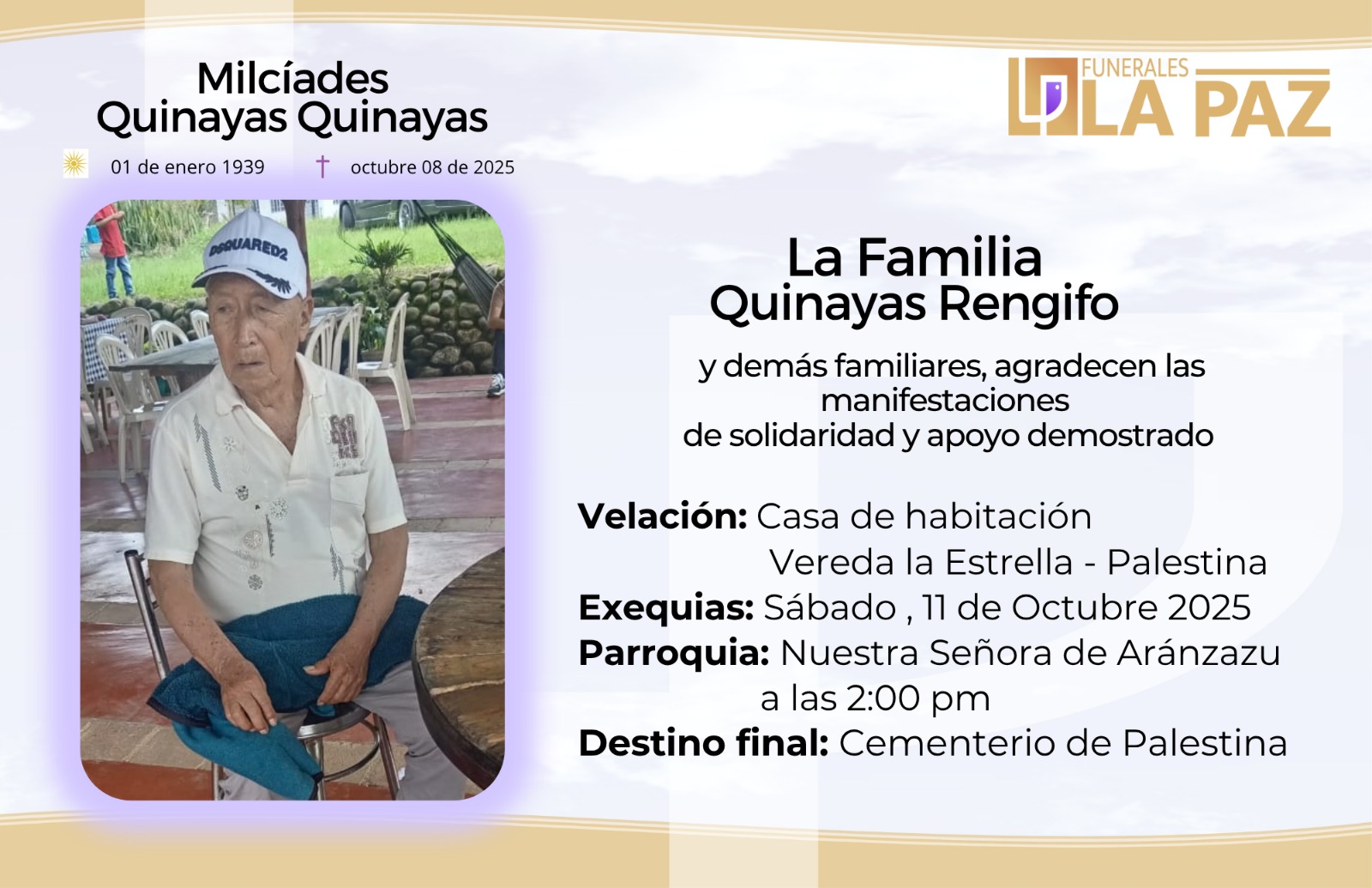 Funerales la Paz se solidariza y se une en oración con la familia Quinayas Rengifo, comunidad en general y amigos en la partida del Sr. Milcíades Quinayas Quinayas.