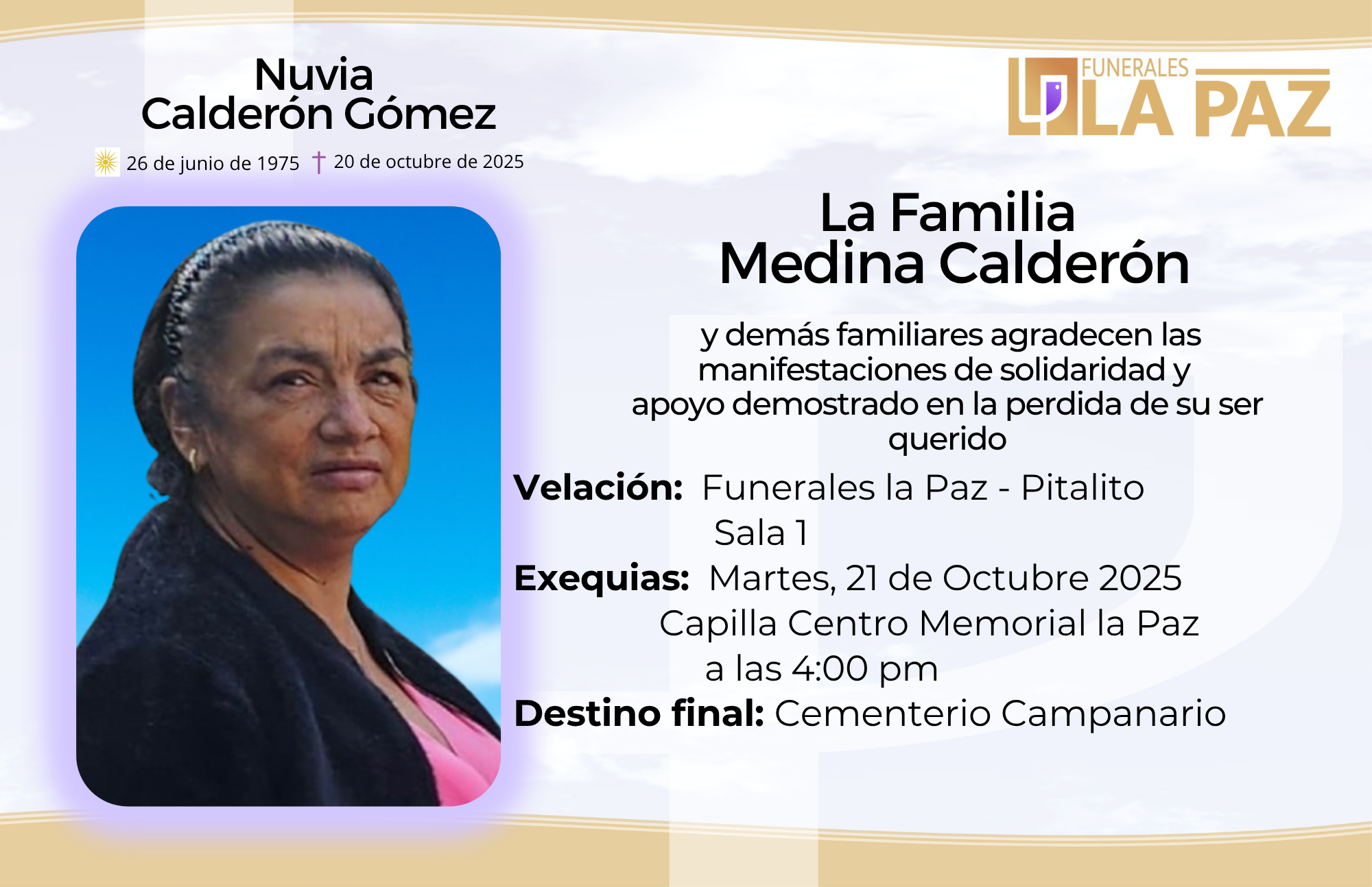 Funerales la Paz se solidariza y se une en oración con la familia Medina Calderón, comunidad en general y amigos en la partida del Sra. Nuvia Calderón Gómez.