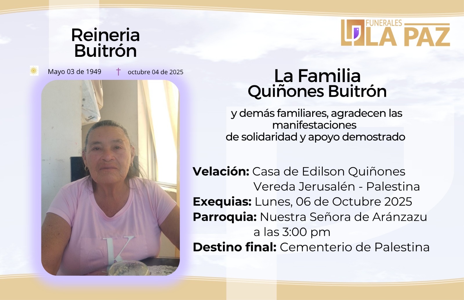 Funerales la Paz se solidariza y se une en oración con la familia Quiñones Buitrón, comunidad en general y amigos en la partida de la Sra. Reineria Buitrón.