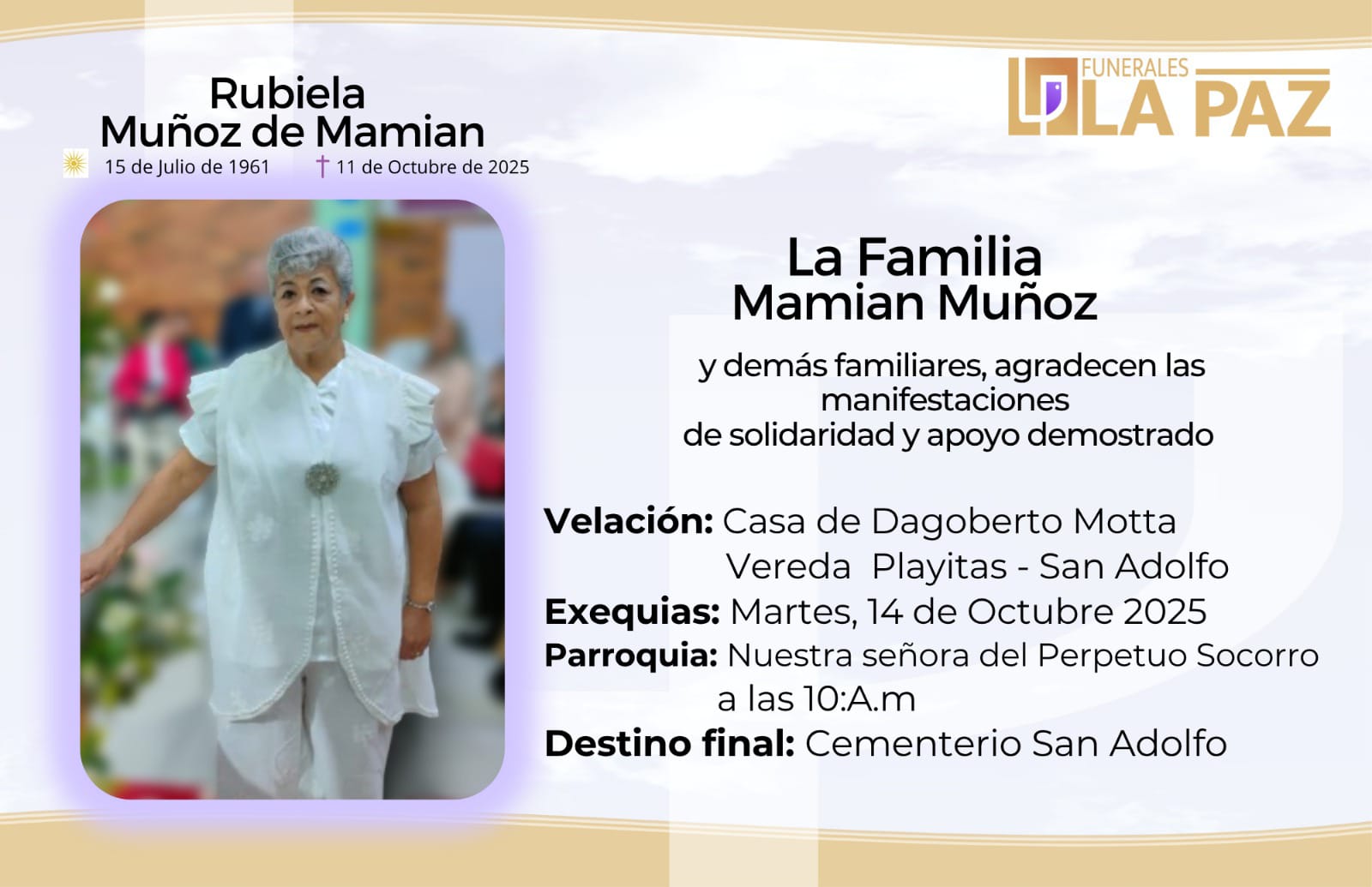 Funerales la Paz se solidariza y se une en oración con la familia Mamian Muñoz, comunidad en general y amigos en la partida de la Sra. Rubiela Muñoz de Mamian.
